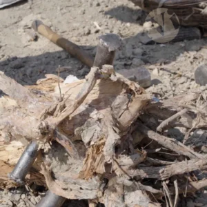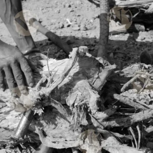 The man is using an axe to chop into a large log, creating wood chips and sawdust – Log, colour and B&W