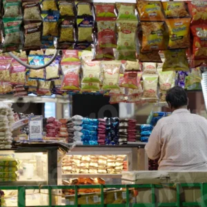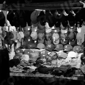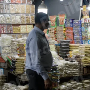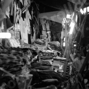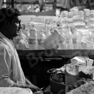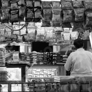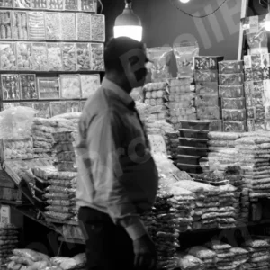 A Man Using a Balance Scale to Weigh Goods in a Market – Log, colour and B&W