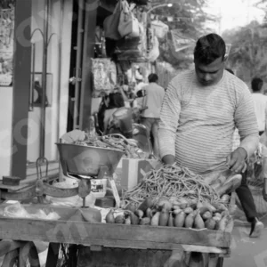 Man Selling Vegetables in a Street Market – Log, colour and B&W