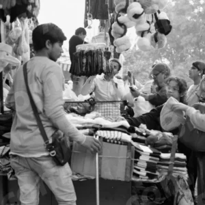 Man Selling Toys and Plying With Her Kid – Log, colour and B&W
