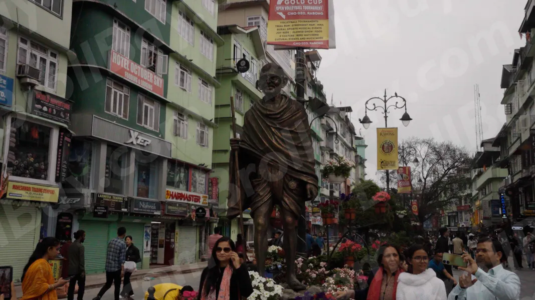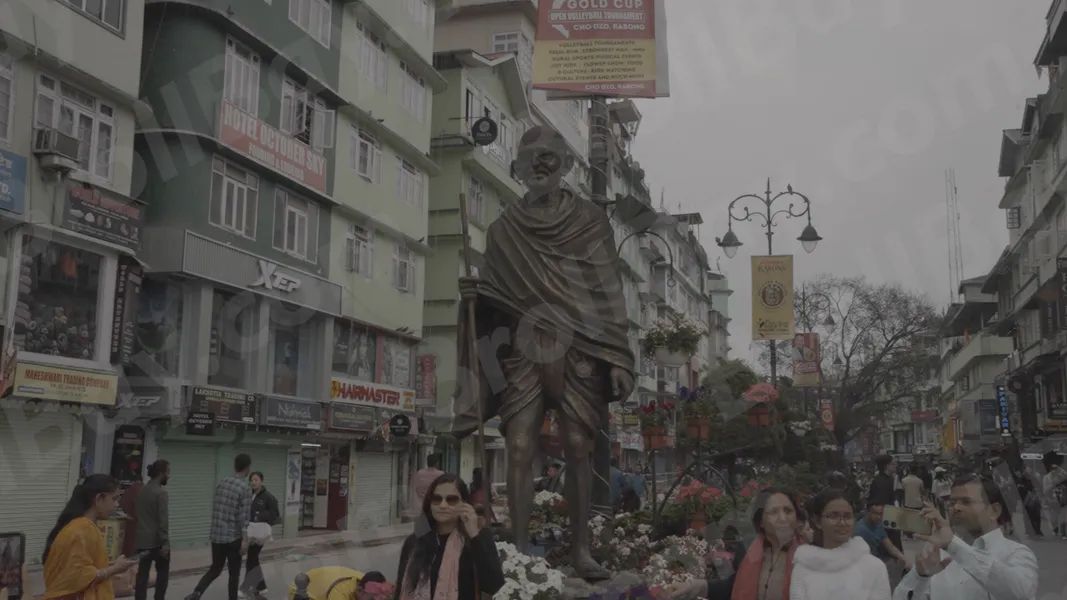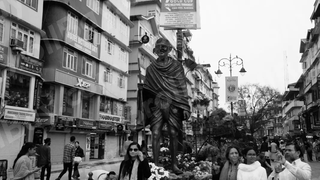 People Taking Pictures with Gandhi ji Statue on Middle of Market Road – Log, colour and B&W