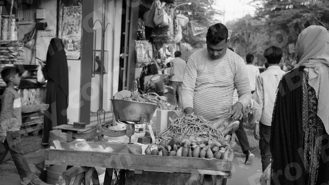 Man Selling Vegetables in a Street Market – Log, colour and B&W